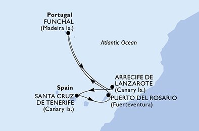 - Arrecife (Lanzarote) -> Santa Cruz de Tenerife Spain -> Puerto Del Rosario/Fuerteventura Spain -> Funchal (Madeira Is.) Portugal -> tengeren -> Arrecife de Lanzarote (Canary Is.) Spain
