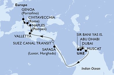 - Dubai -> Dubai U. Arab Emirates -> Abu Dhabi U. Arab Emirates -> Sir Bani Yas Is U. Arab Emirates -> tengeren -> Muscat Oman -> tengeren -> tengeren -> tengeren -> tengeren -> tengeren -> Safaga Egypt -> Suez Canal (transit) Egypt -> Suez Canal (transit) Egypt -> tengeren -> tengeren -> Valletta Malta -> Naples (Pompeii) Italy -> Civitavecchia (Rome) Italy -> Genoa (Portofino) Italy